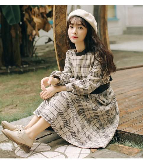 人気秋冬チェック柄 バルーンスリーブ フレア ミモレ丈 バイカラー ベルト ガーリー 女子会 トレンド 636