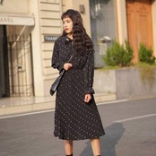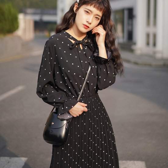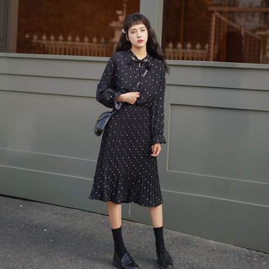 おすすめ 新作 春物水玉 ドット ミディアム丈 プリーツ 女子会 デート 通学 カジュアル593
