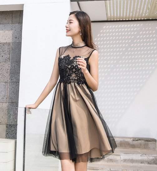 シースルー レース 刺繍 シフォン バイカラー 膝丈 パーティードレス 結婚式 二次会 着回し◎ 196