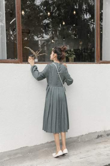 おすすめ 冬物ワンピ ドット柄 水玉プリーツ フレア ミモレ丈 ガーリー トレンド924
