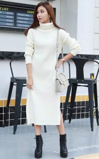 オルチャン韓国冬 新作 タートルネック リブ ニット 膝丈 膝丈 エレガント 膝丈 スリットきれいめデート 454