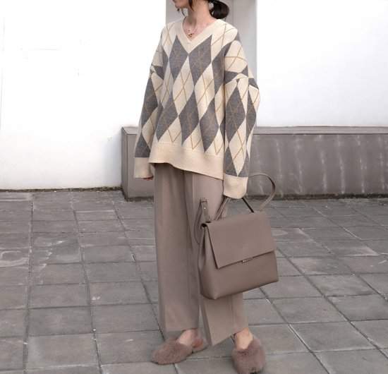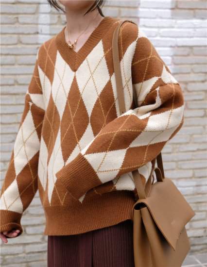 オルチャン韓国おすすめ トレンド 人気 売れ筋 アーガイル トラッド ニットVネック ゆったり カジュアル ガーリー547