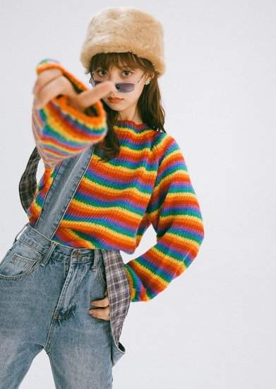 オルチャン韓国おすすめ 人気 売れ筋 ニットクルーネック ボーダー マルチカラー ポップ カジュアル ゆったり 秋冬171