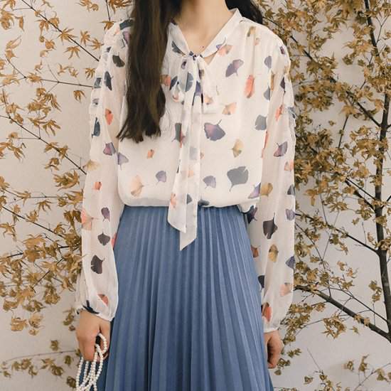人気 売れ筋 春物きれいめシフォン花柄 ボウタイ 透け感 ゆったり デート428