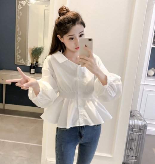 春物 新作Vネックゴム ランタンスリーブ ボタン 襟付き デート908