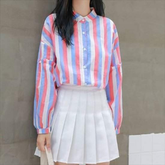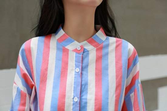 春 バンドカラー マルチストライプ ゆったり ドロップショルダー スタンドカラー フェミニン きれいめ 袖切り替え695