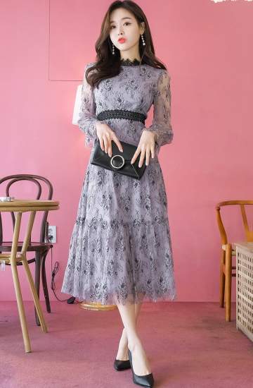 春 花柄 シフォンレース シフォンドレス ハイウエスト 編み上げ 上品ワンピ ワンカラー シンプル 清楚 お嬢様風 976