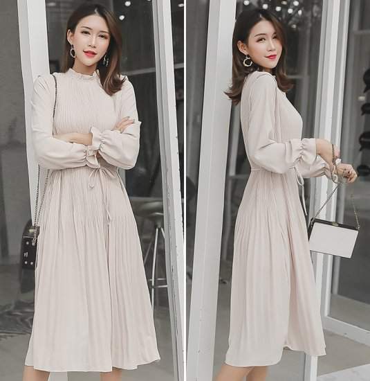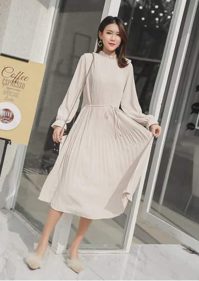 シフォンワンピ フリルネック プリーツ アプリコット ピンクカラーエクリュカラー フレアスリープ ハイウエストエクリュ ナチュラル シンプル 92
