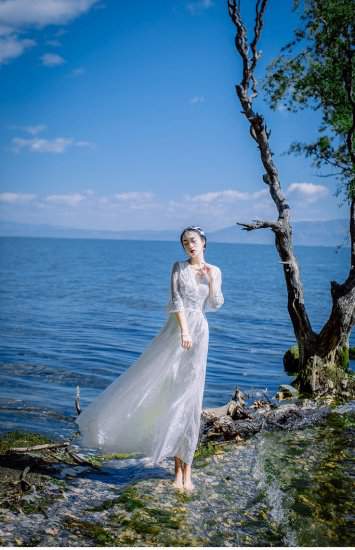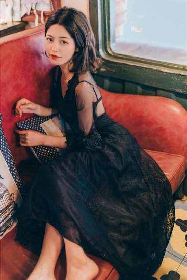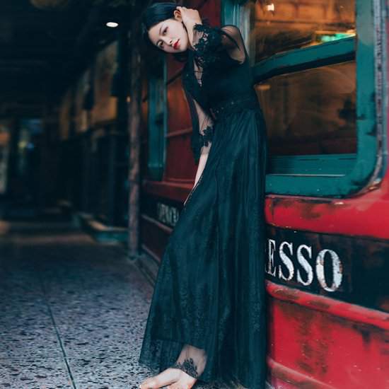 ドレス ロング マキシ丈シースルー袖 ハイウエスト ベルスリープ ブイネック ミドル袖633