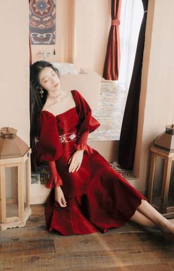 ロング 赤 ランタンスリープ ハイウエストスクエアカラーお呼ばれ 次会 結婚式 947