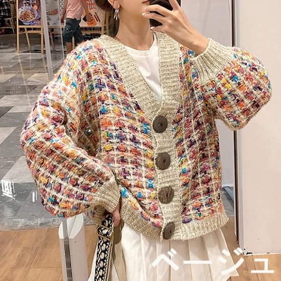 オルチャン韓国 オーバーサイズ おしゃれ カジュアル きれいめカラフル ゆったり ふわふわ マルチカラー Vネック カーディガン874