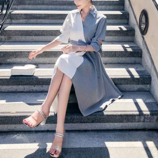 夏新作春新作 ロング 春 春夏 バイカラーストライプ×ホワイト アシメVネック ブイネック ハイウエスト膝下丈 エレガント おでかけ 669