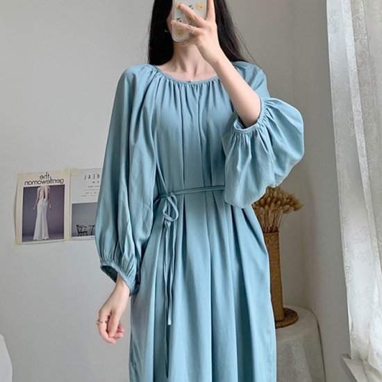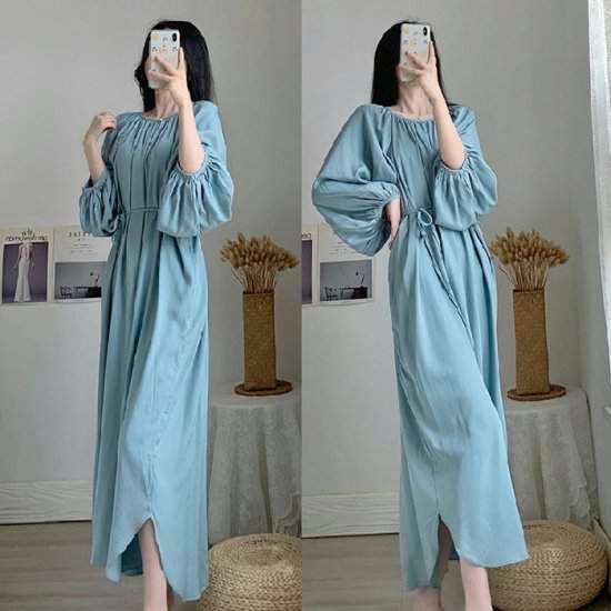 ロングリボン夏ブイネック プルオーバー 膝下丈 ミモレ丈 ランタンスリーブ フレンチロングブルー 687