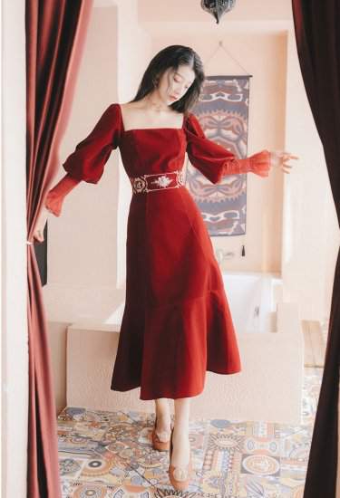 ロング 赤 ランタンスリープ ハイウエストスクエアカラーお呼ばれ 次会 結婚式 947